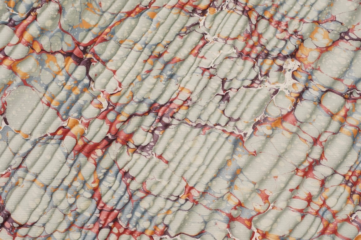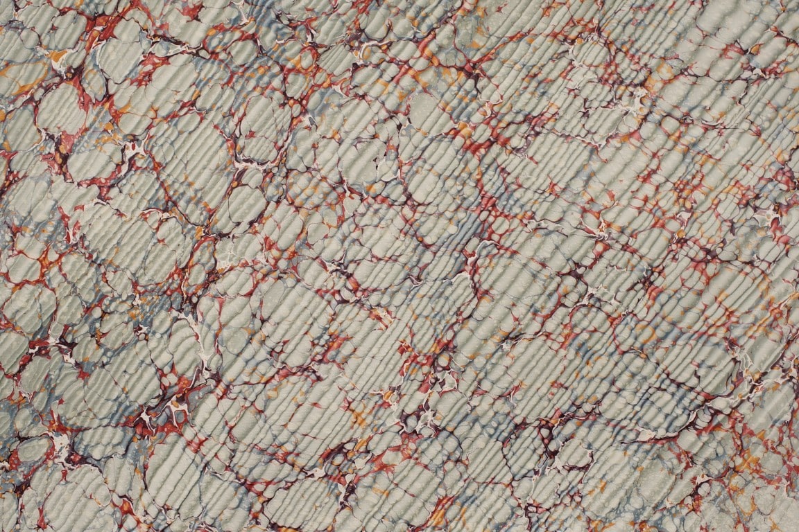 Les feuilles sont marbrées à la main et peuvent avoir de légères variations de tonalités dans les couleurs. Le support est du papier Ingres d’Arches, 50x65cm, 85g, sans acide, 75% coton, fabriqué en France. Les colorants sont des encres d’imprimeries diluées à l’essence de térébenthine. L’allongement du papier se fait dans le sens de la longueur de la feuille. Le poids de chaque feuille est de 30 grammes Le prix est de 17€ la feuille. TVA non applicable, (article 293b du CGI) Le délai de préparation de votre commande est de 1 à 3 jours ouvrés.