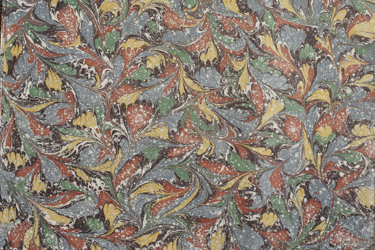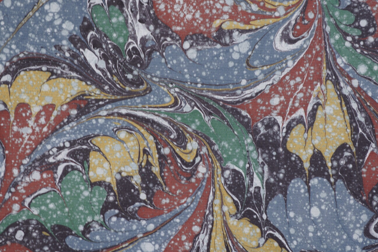 Papier marbré à la main motif feuillage aux 4 coloris d’automne mochetés gris sur fond noir d’après un modèle de Baris