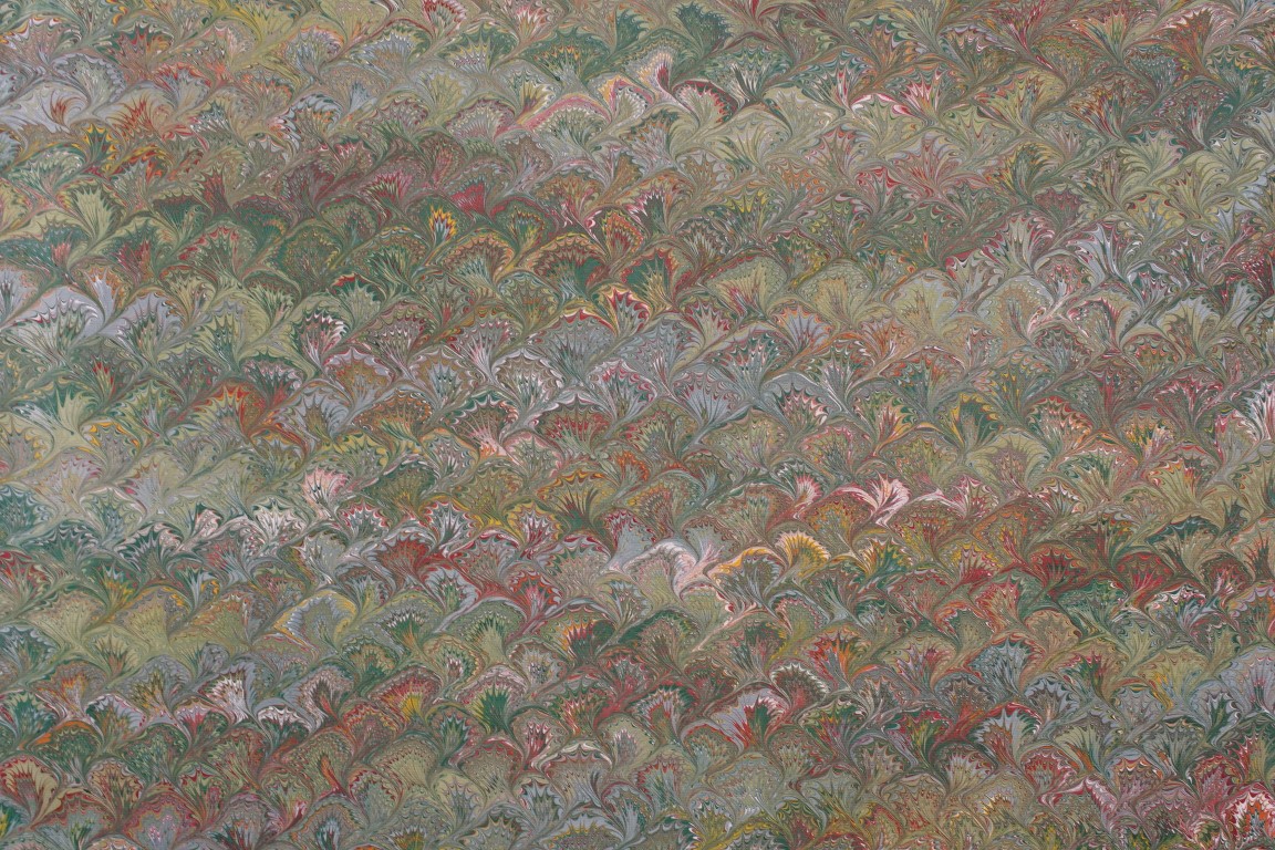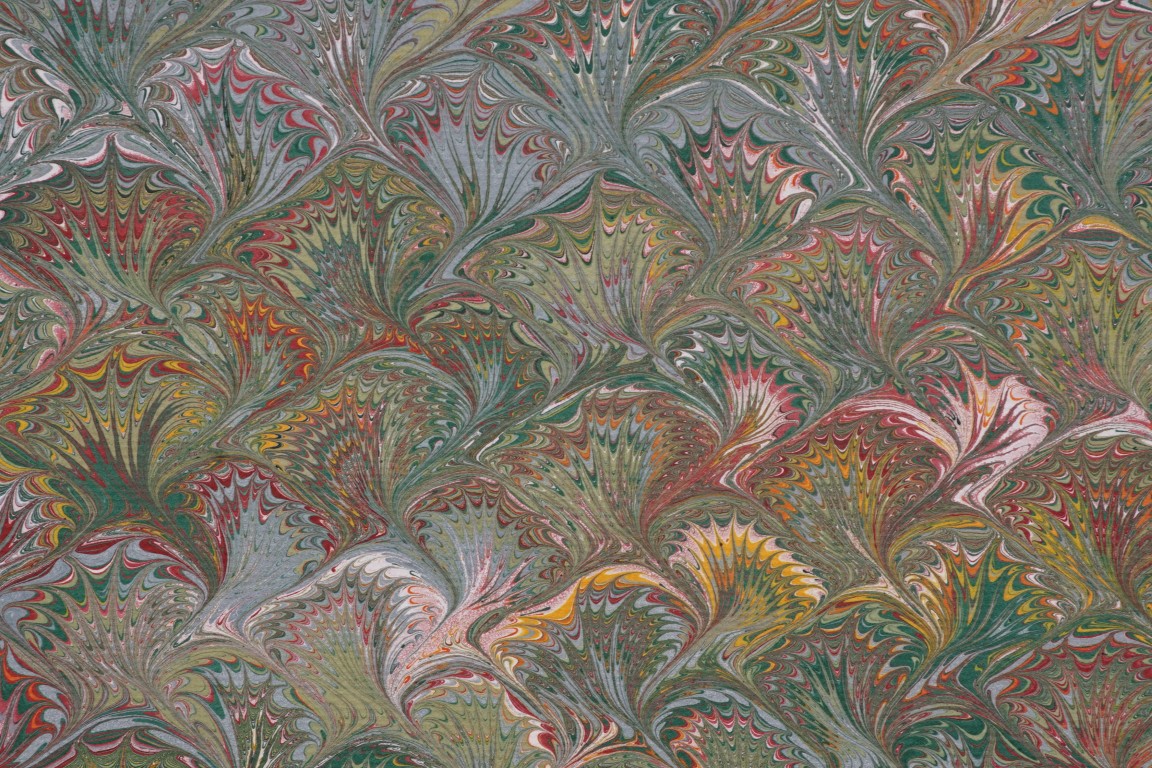 Papier marbré à la main motif Queue de Paon large et coloris Vert dans une harmonie lumineuse